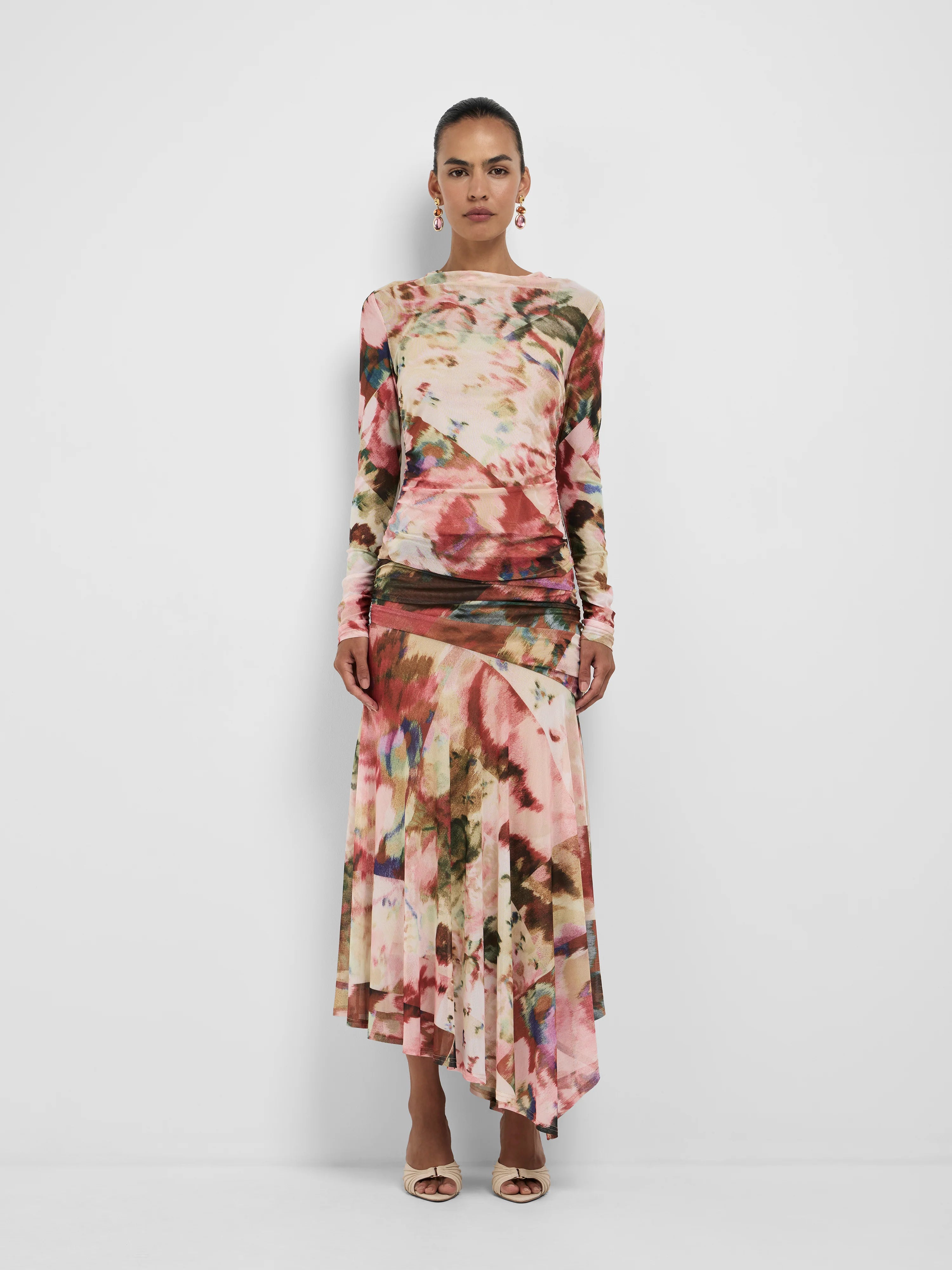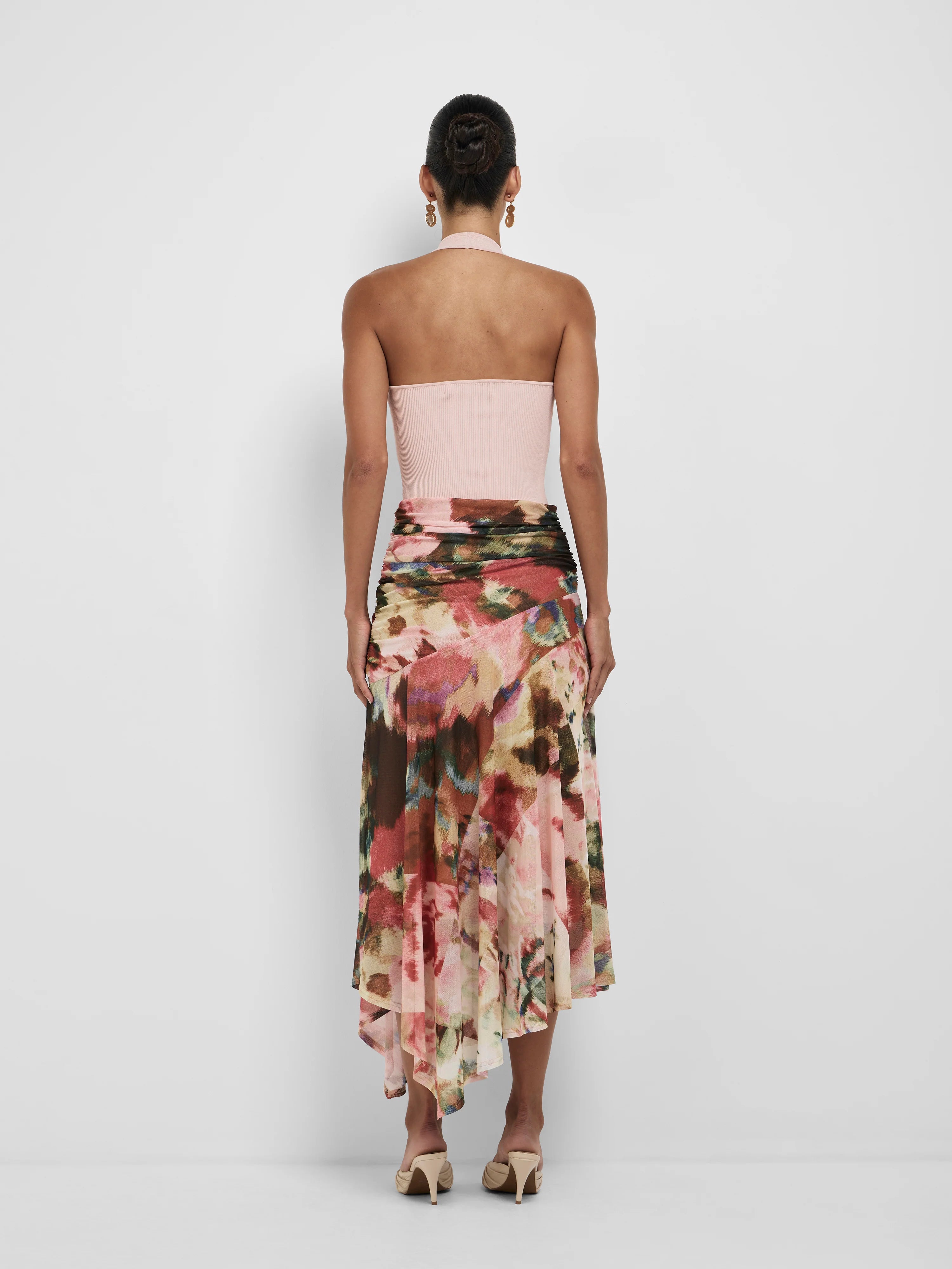 A floral icon in the making, meet the Faye Midi Skirt. Featuring printed stretch mesh fabrication, fit-and-flare midi length styling, encased elastic waistband, ruching at the side waist, asymmetrical waist seam, and an asymmetrical hemline, finished with full lining. Style with the Faye Long Sleeve Top.