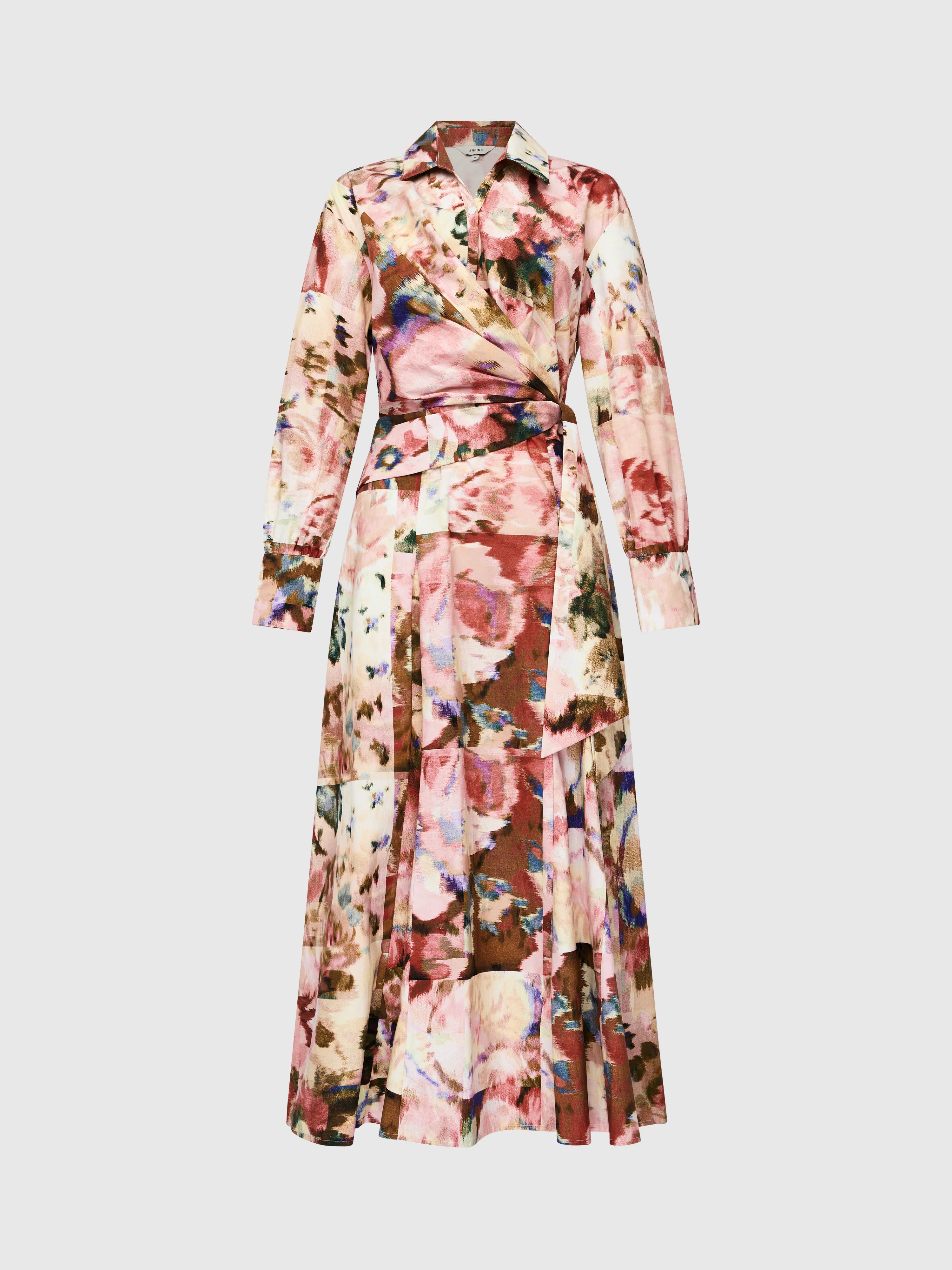 A fresh take on florals, meet the Faye Shirt Dress. Featuring a 100% cotton woven fabrication, fit-and-flare full-length silhouette, collared neckline with full-length sleeves, wrap overlay with tie, front button closure, pleating detail at the back waistband, full circle hemline, and an invisible side zip. Complete the look with the Alana Earrings.