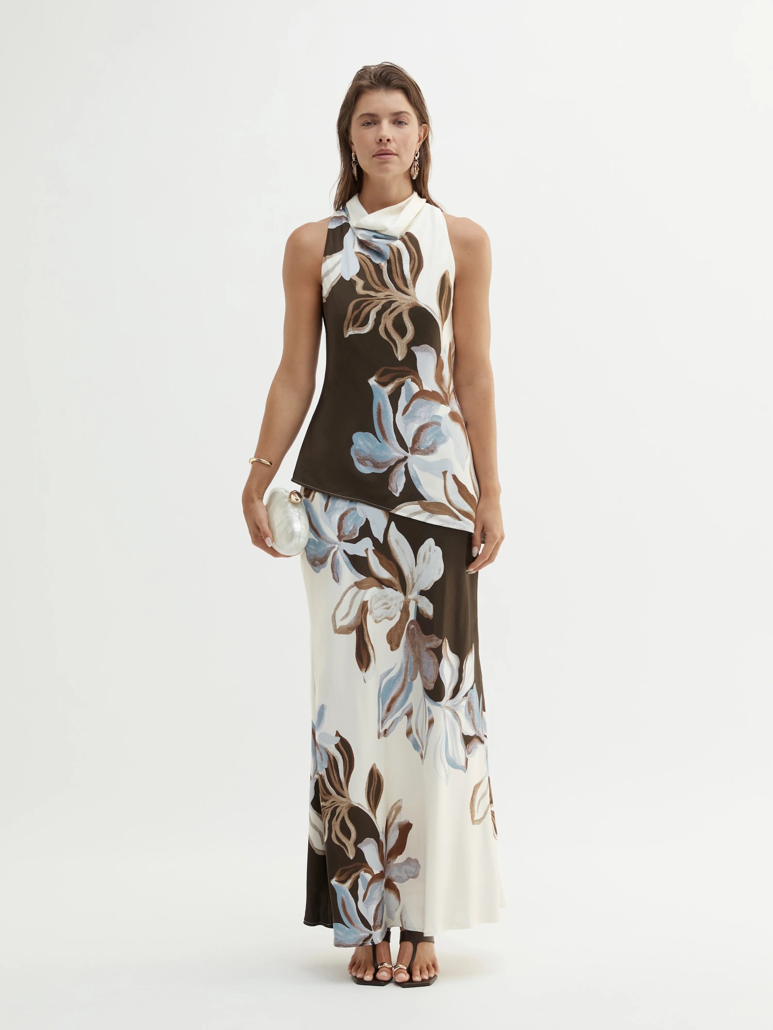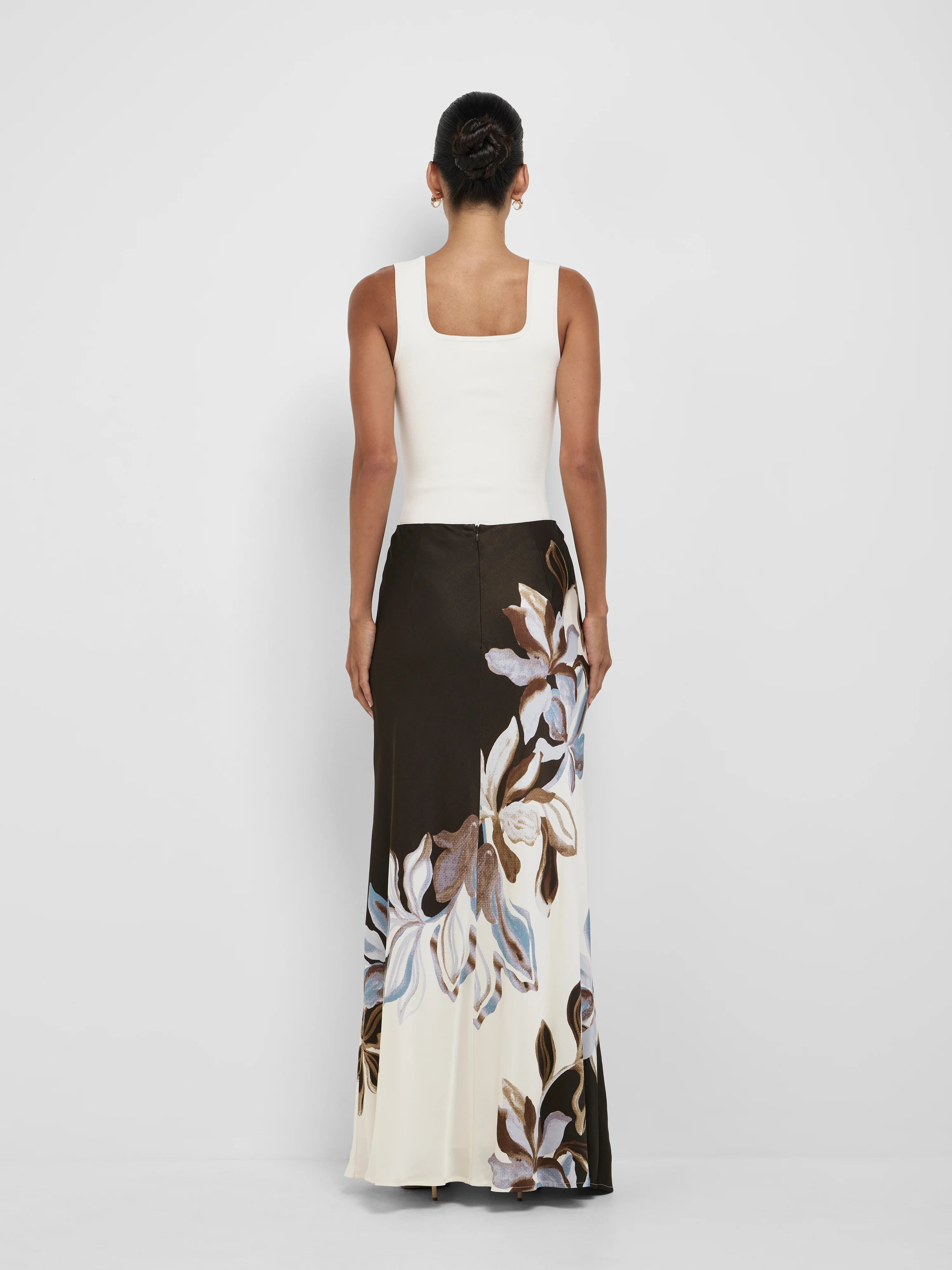 Soft satin, striking florals – introducing the Fiora Maxi Skirt. Featuring satin finish woven fabrication with full lining, slim fit with maxi length styling, mid-rise fixed waist, invisible back zip closure, placement floral print throughout, and a flattering A-line skirt. Complete the look with the Fiora Top.