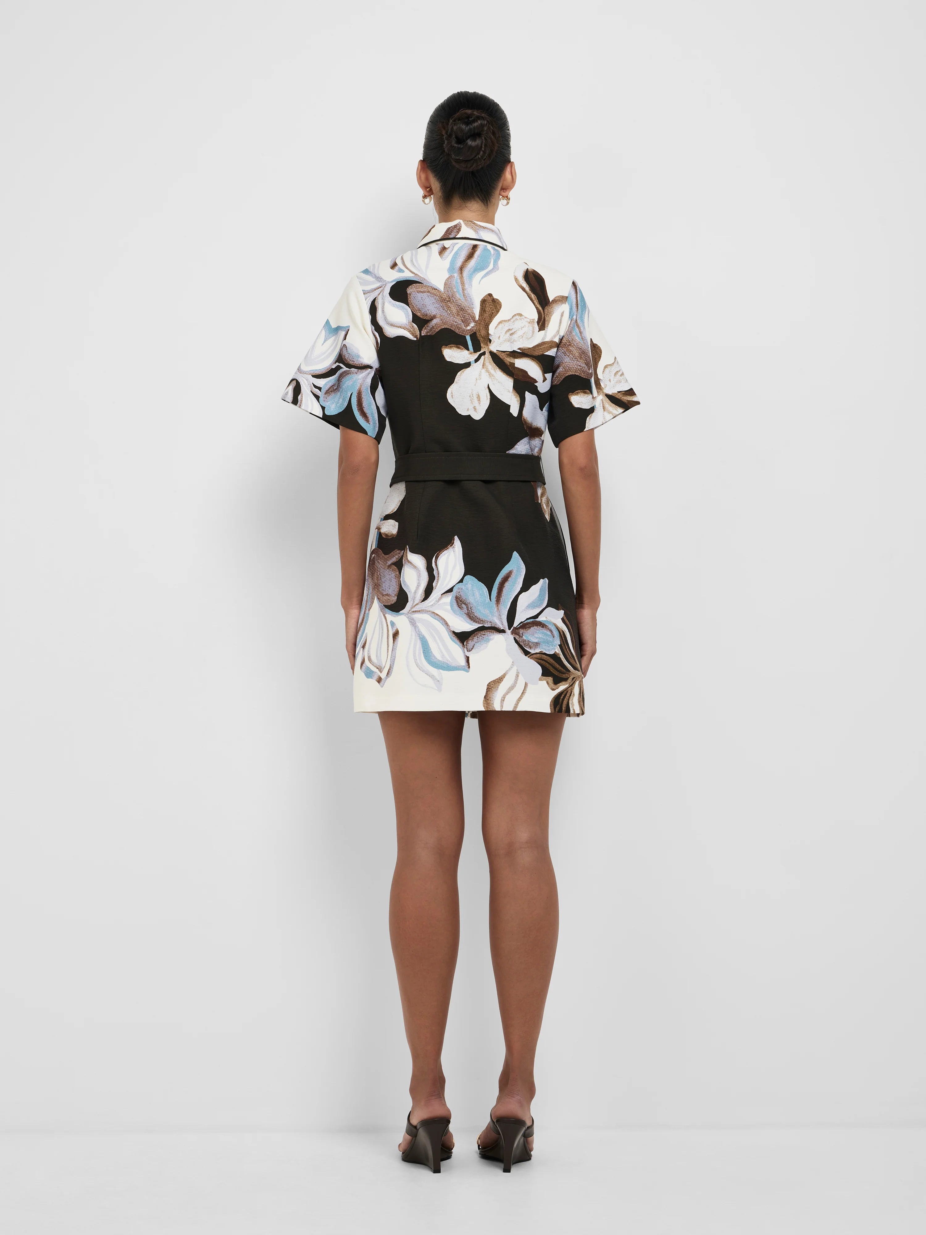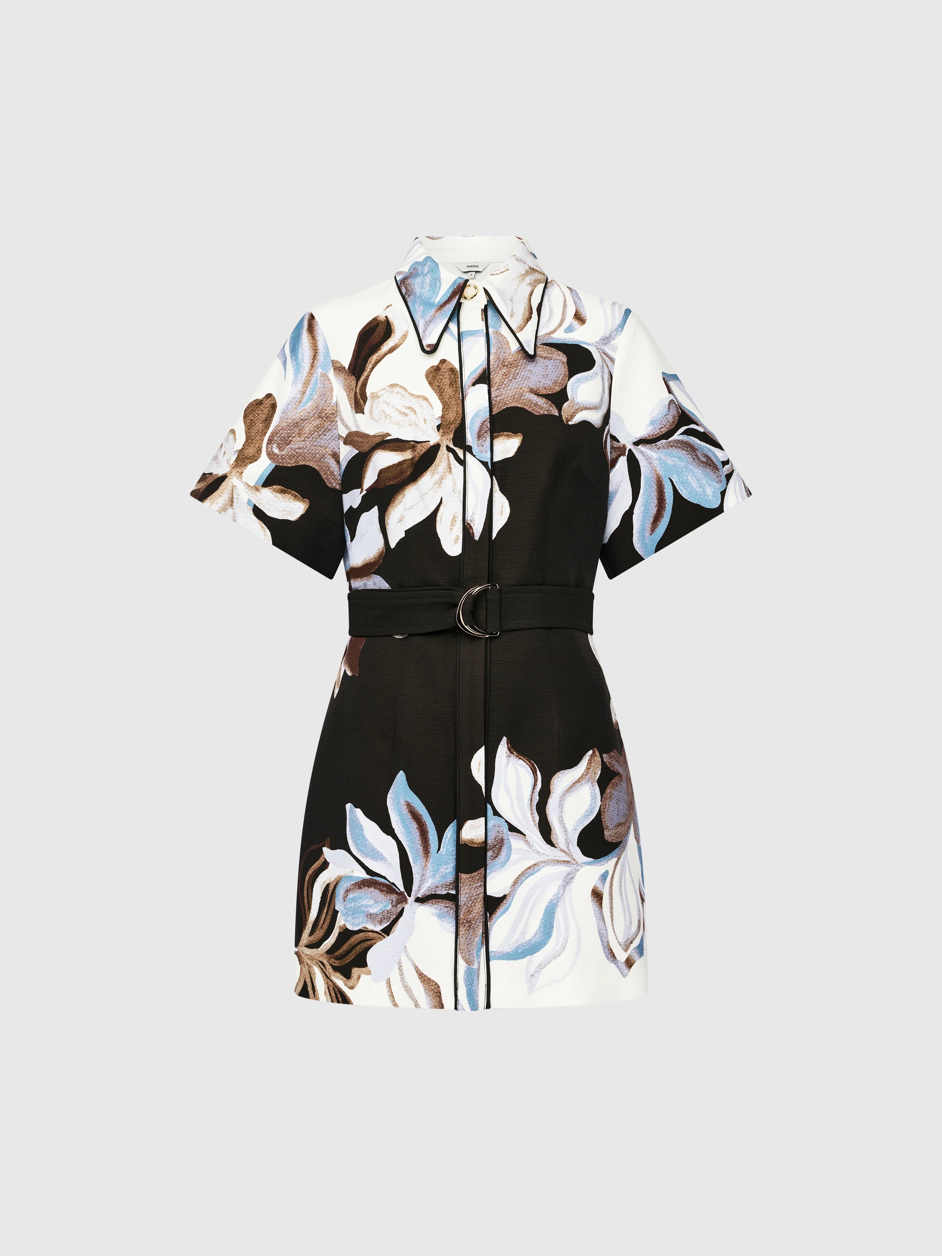 Floral charm, tailored shape – meet the Fiora Mini Shirt Dress. Featuring lightly bonded woven fabrication with lined body, fit-and-flare mini-length styling, collared neckline with short sleeves, gold statement top button, concealed front closure, placement floral print, contrast piping, and a self-fabric belt with soft gold buckle. Style with the Firework Earrings.