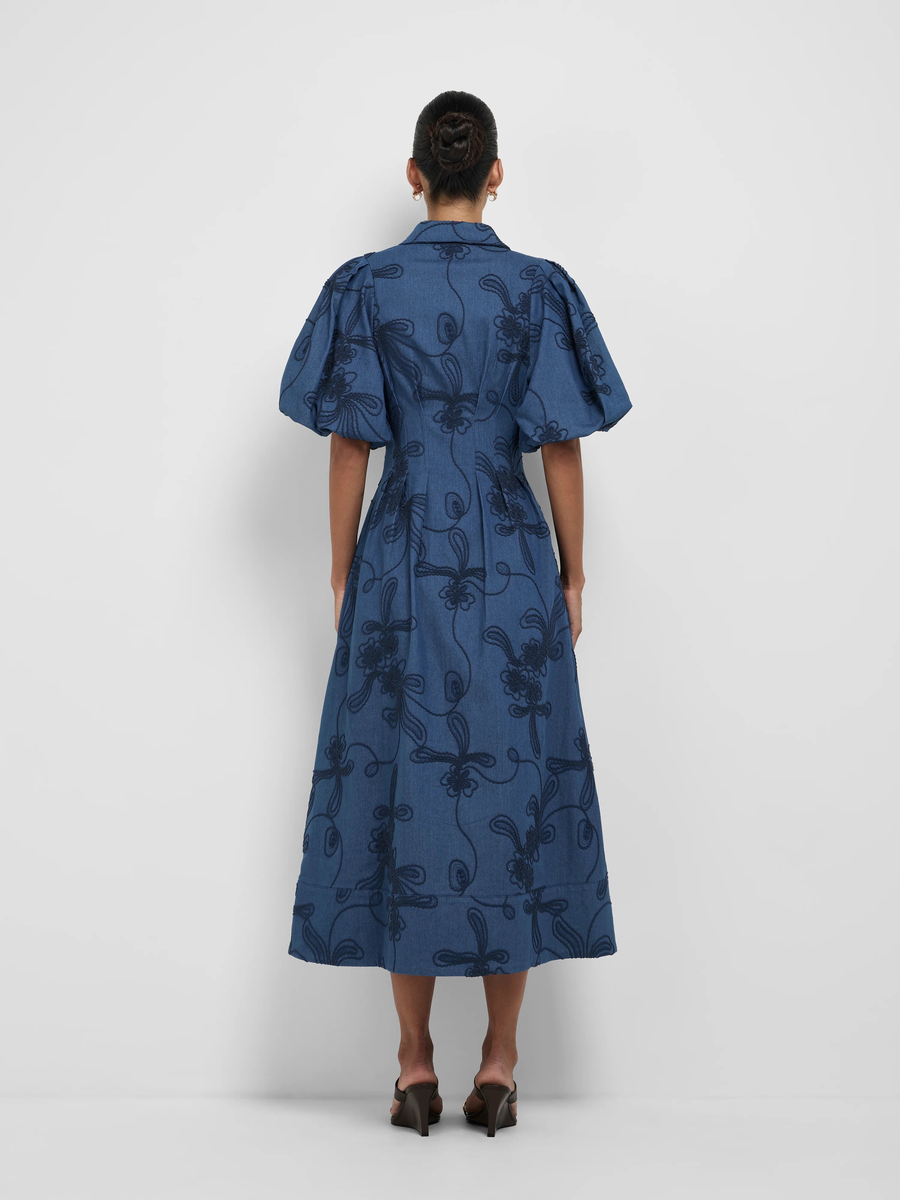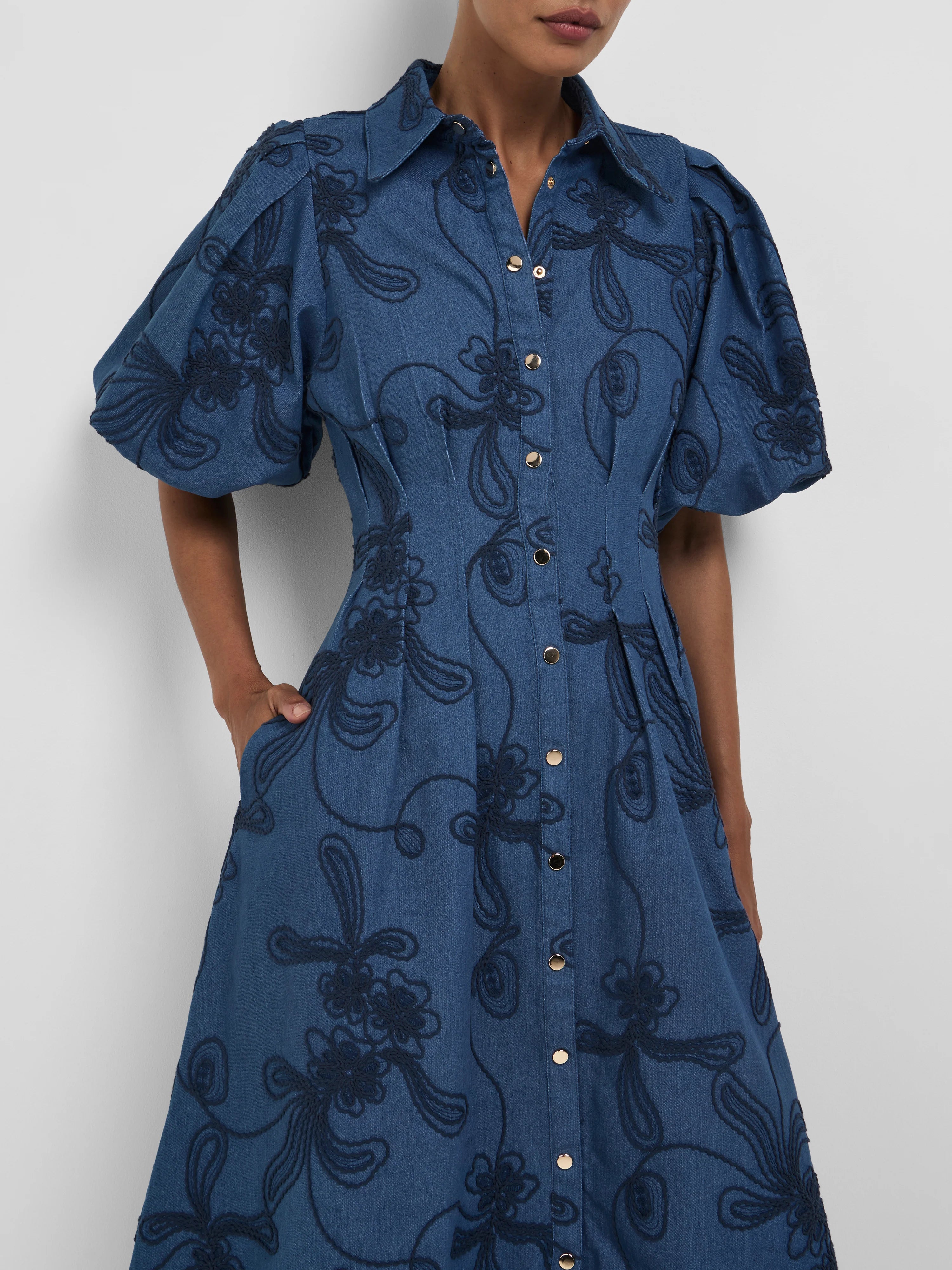 Effortless charm meets modern detailing, introducing the Hazel Midi Dress. Featuring woven stretch denim, fit-and-flare midi silhouette, collared neckline with gold button-down front, short puff sleeves, shoulder and waist pleating, concealed pockets, and embroidered floral detailing. Complete the look with the Tammy Earrings.