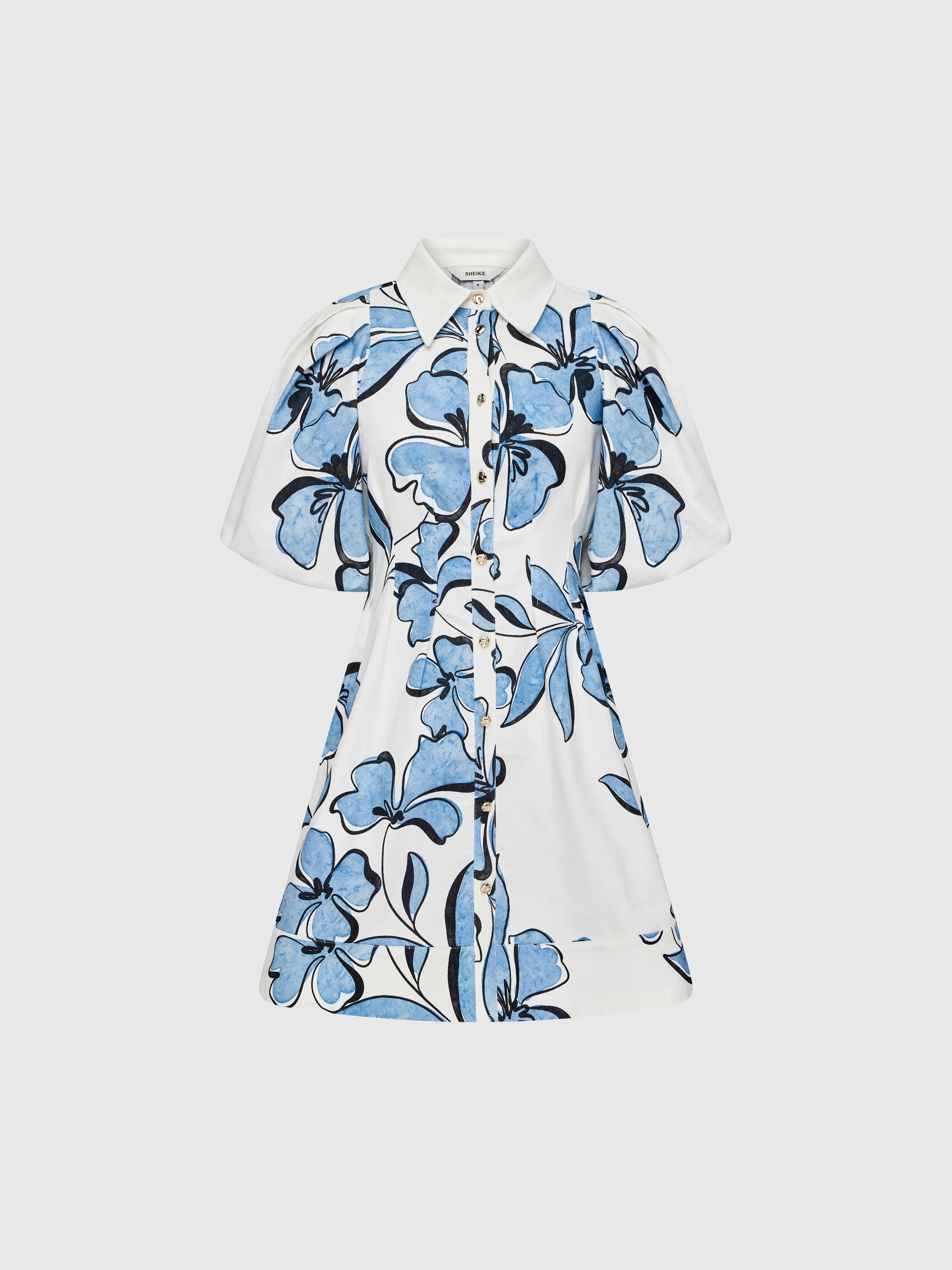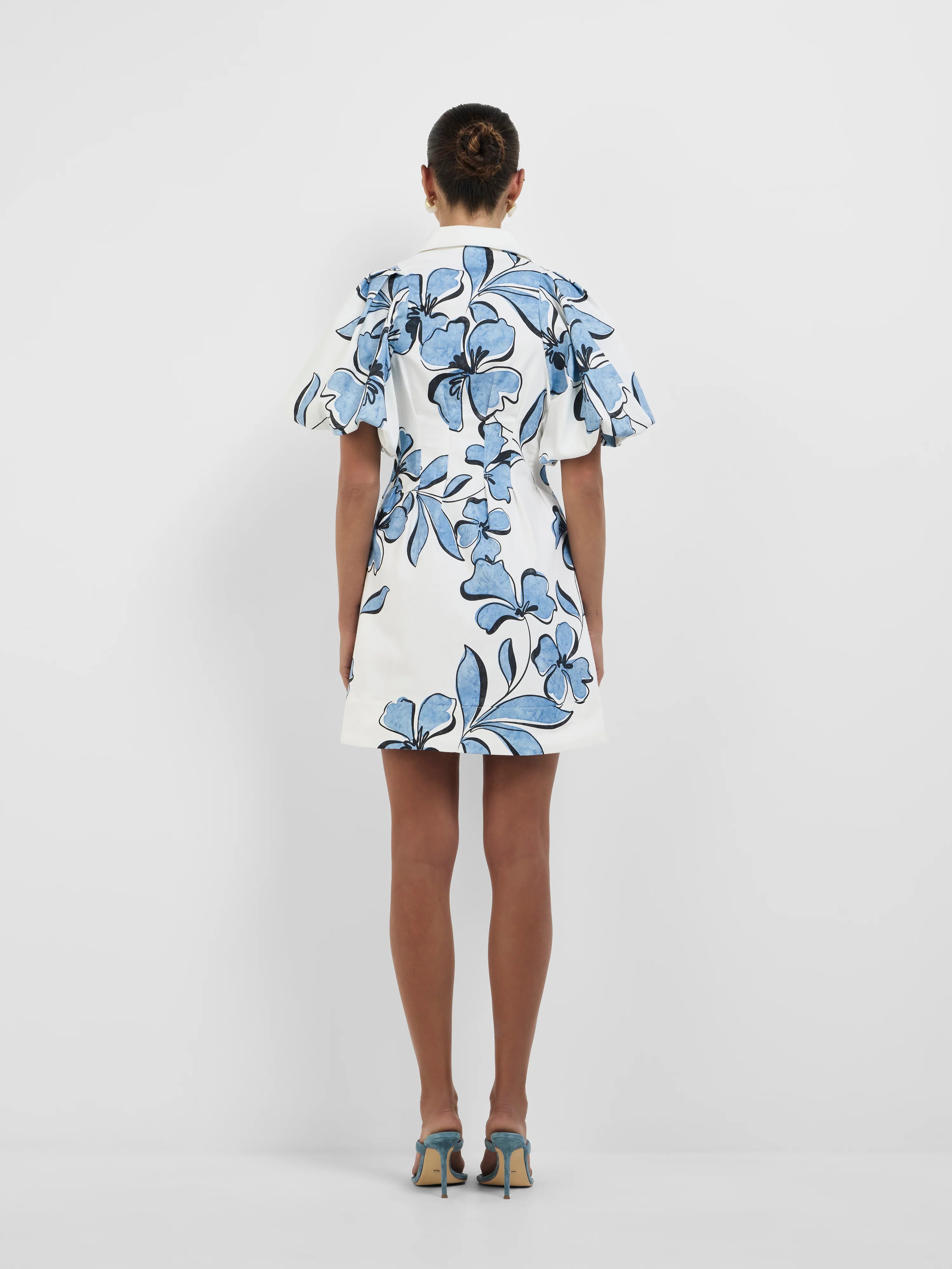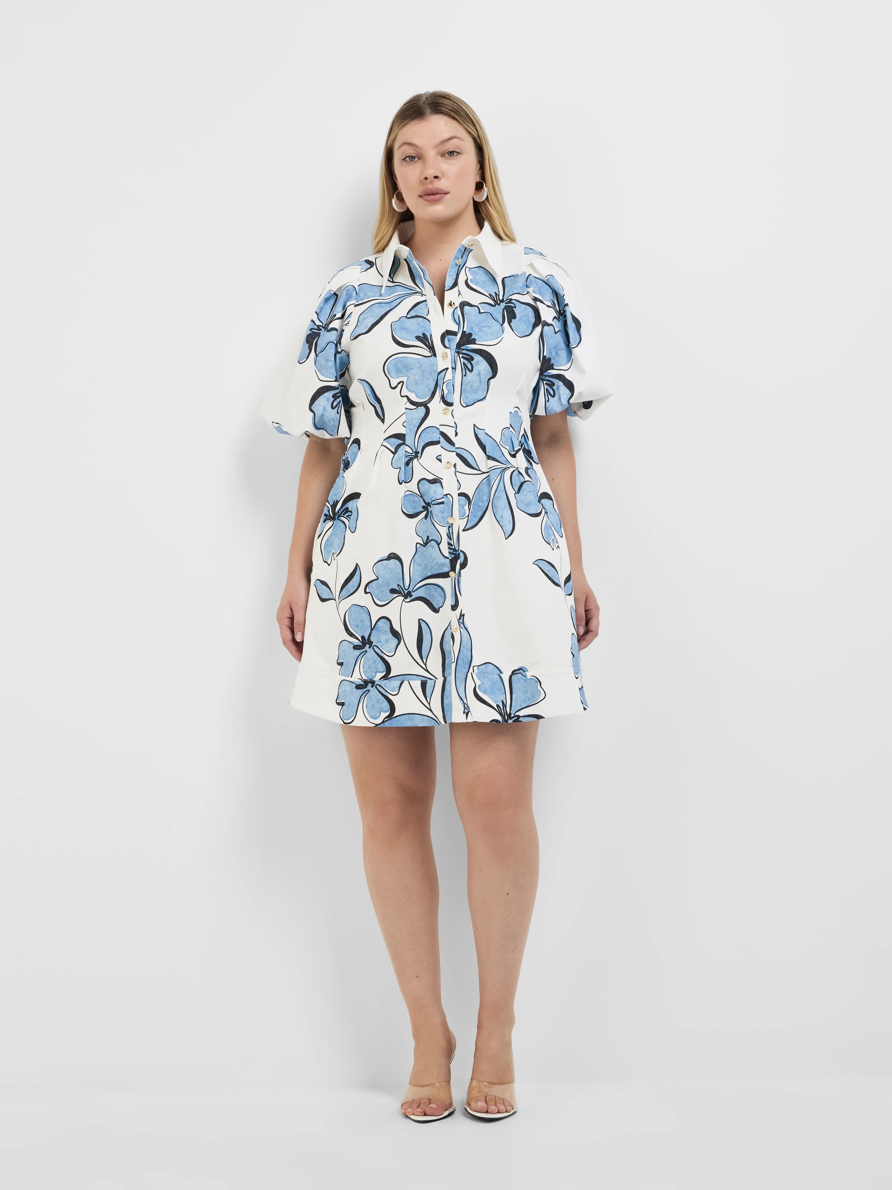Made for sunny days - Introducing the Hibiscus Mini Dress. Featuring a denim cotton-blend fabrication, fit-and-flare shape, classic shirt collar neckline, bubble sleeves, gold detail buttons, and a vibrant hibiscus print. Pair with our Wendy Earrings to complete the look.