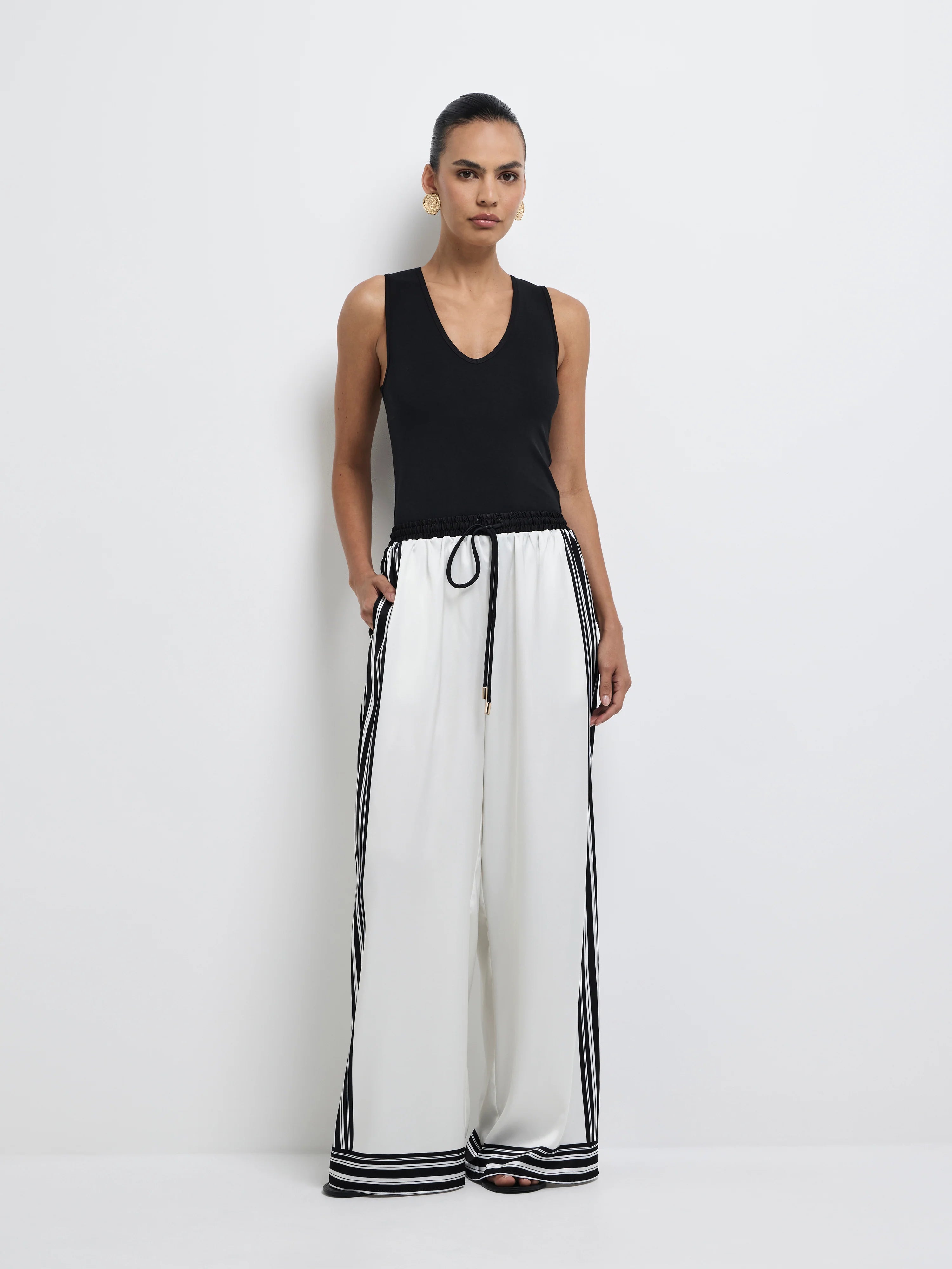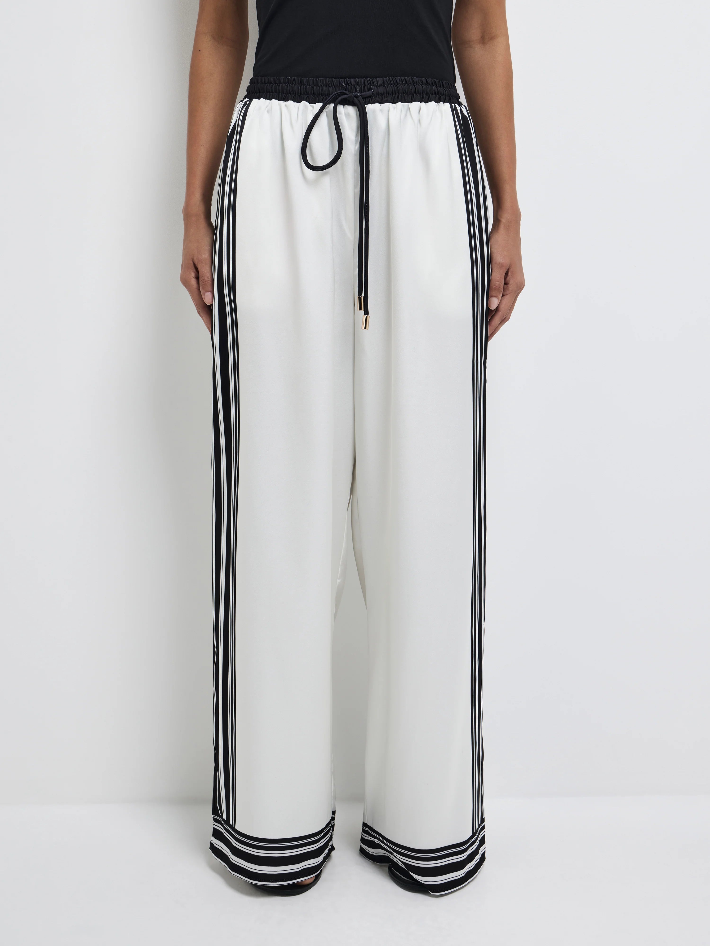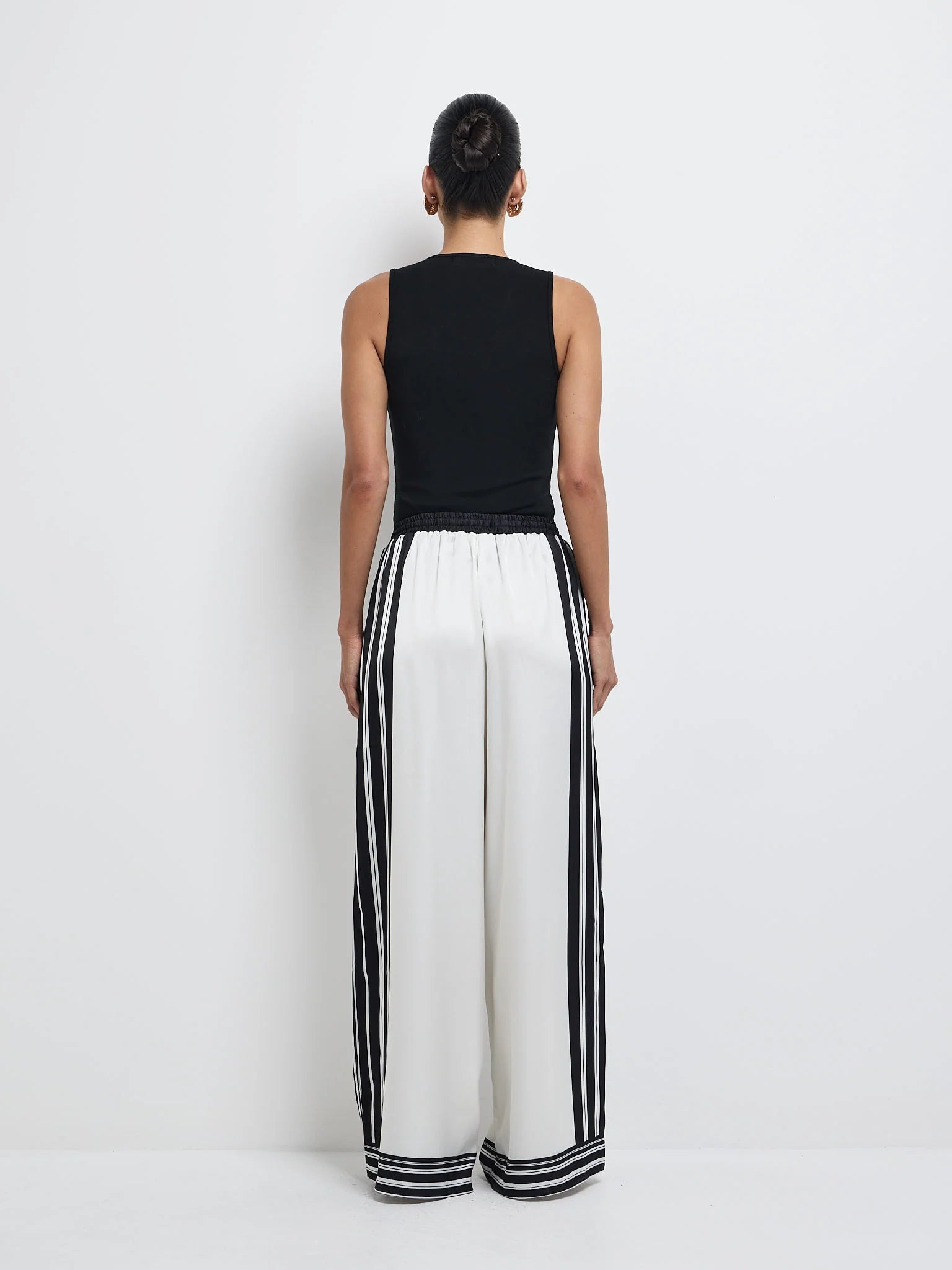 Sleek, versatile, effortless. The Lisa Pant brings ease to every occasion. Showcasing a printed satin fabrication, elasticated waistband with drawstring, wide-leg silhouette, placement print stripe detail on side seams and hem and pockets. Pair with our Lisa Top for a coordinated look.