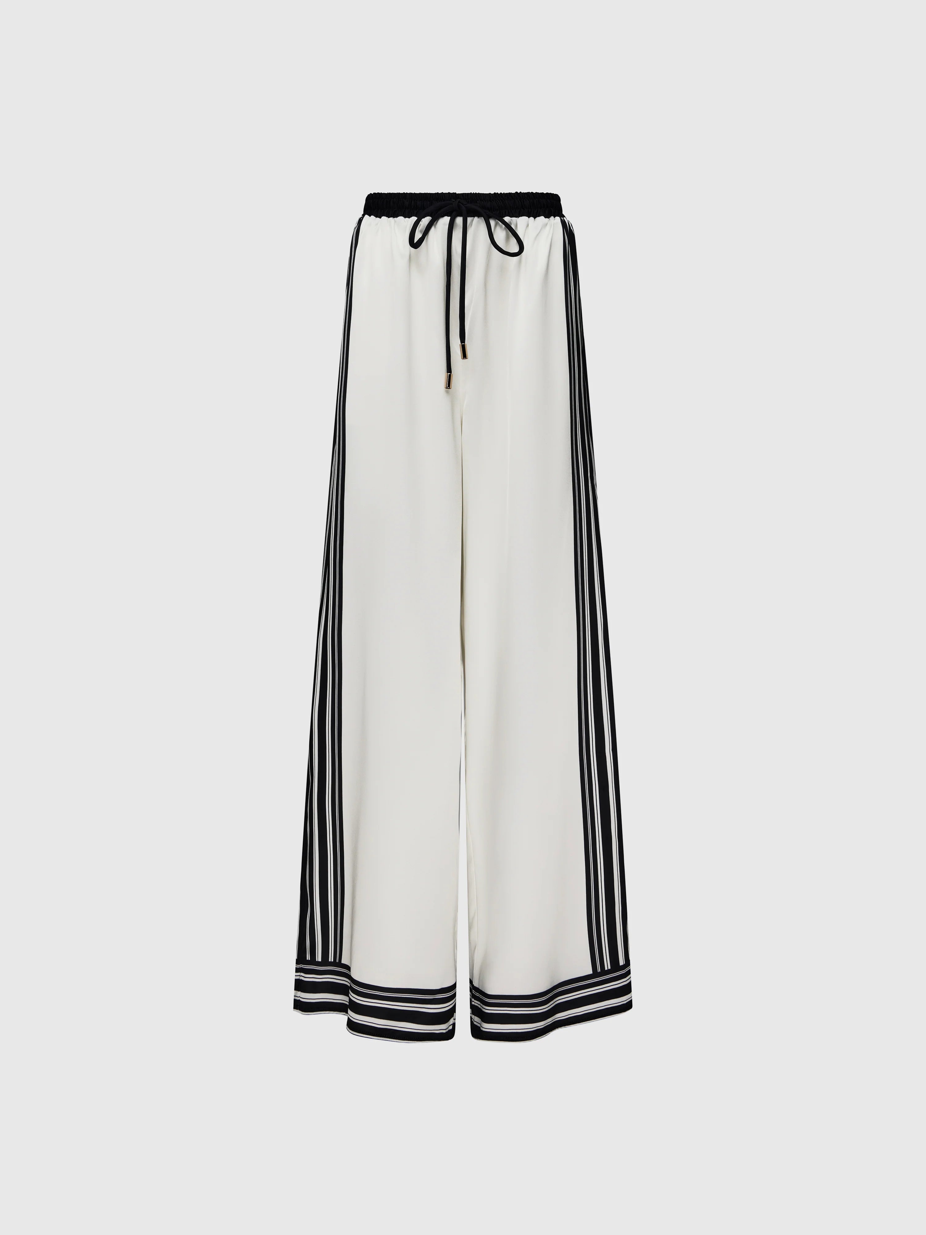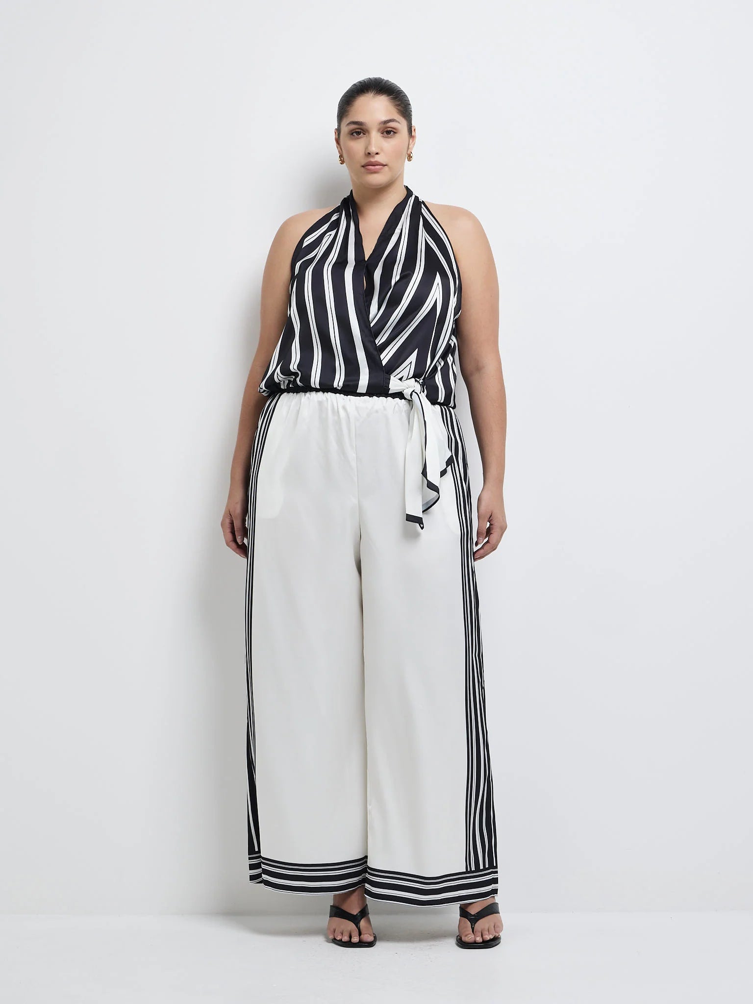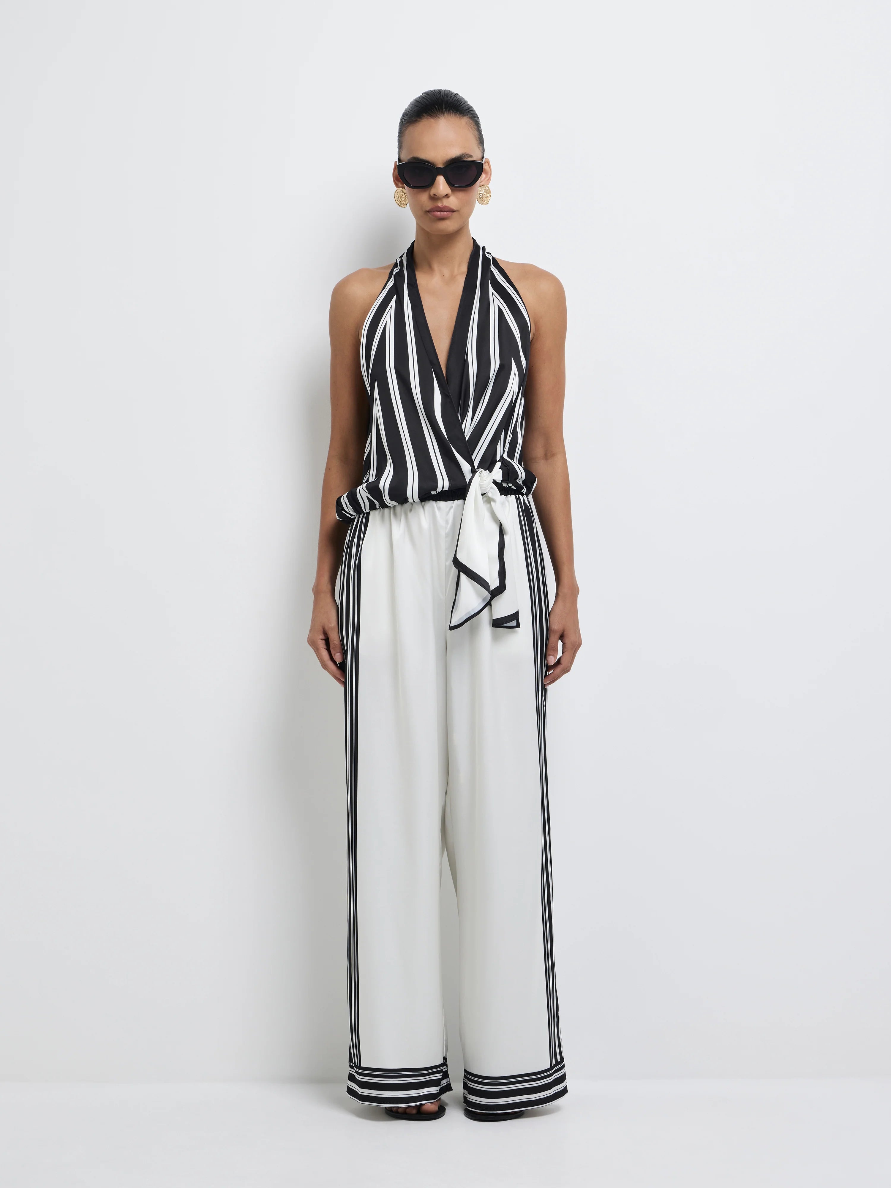 Sleek, versatile, effortless. The Lisa Pant brings ease to every occasion. Showcasing a printed satin fabrication, elasticated waistband with drawstring, wide-leg silhouette, placement print stripe detail on side seams and hem and pockets. Pair with our Lisa Top for a coordinated look.
