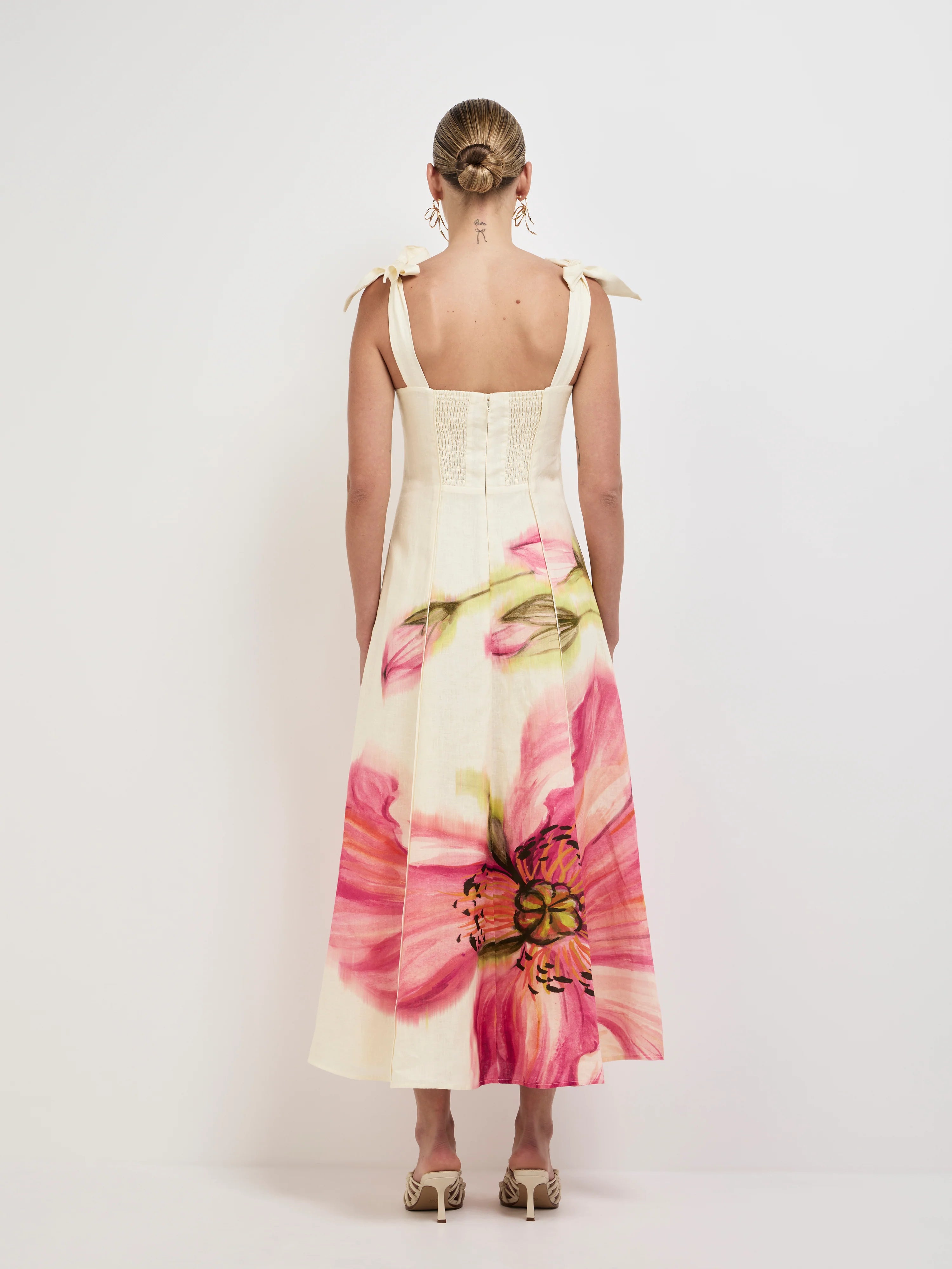 A brushstroke of beauty - Introducing the Poppy Midi Dress. Showcasing a floral printed 100% Linen fabrication, fit and flare styling, midi skirt length, princess seams at front and back with bind detail, shirring panel at back and adjustable shoulder tie straps. Pair with our Sloane Earrings to complete the look.