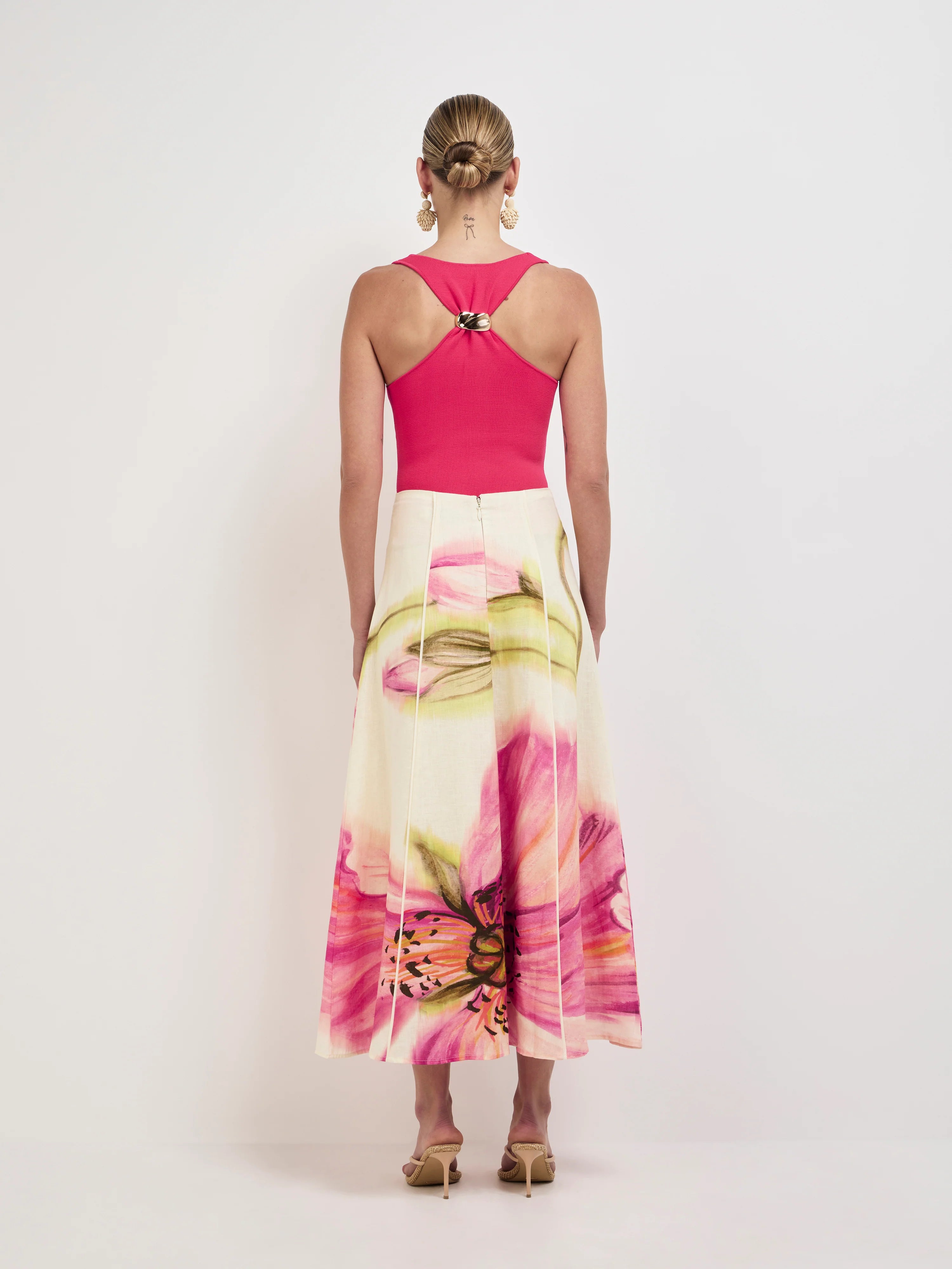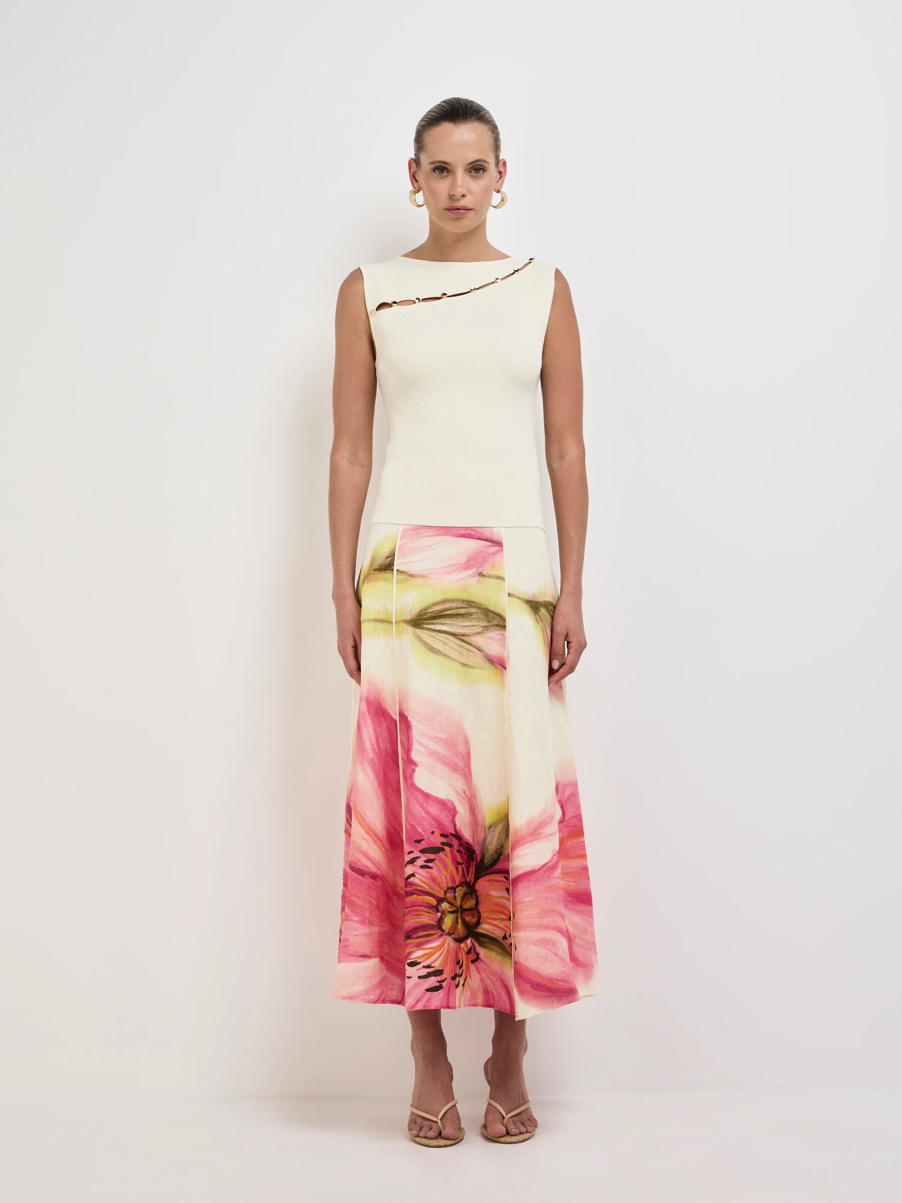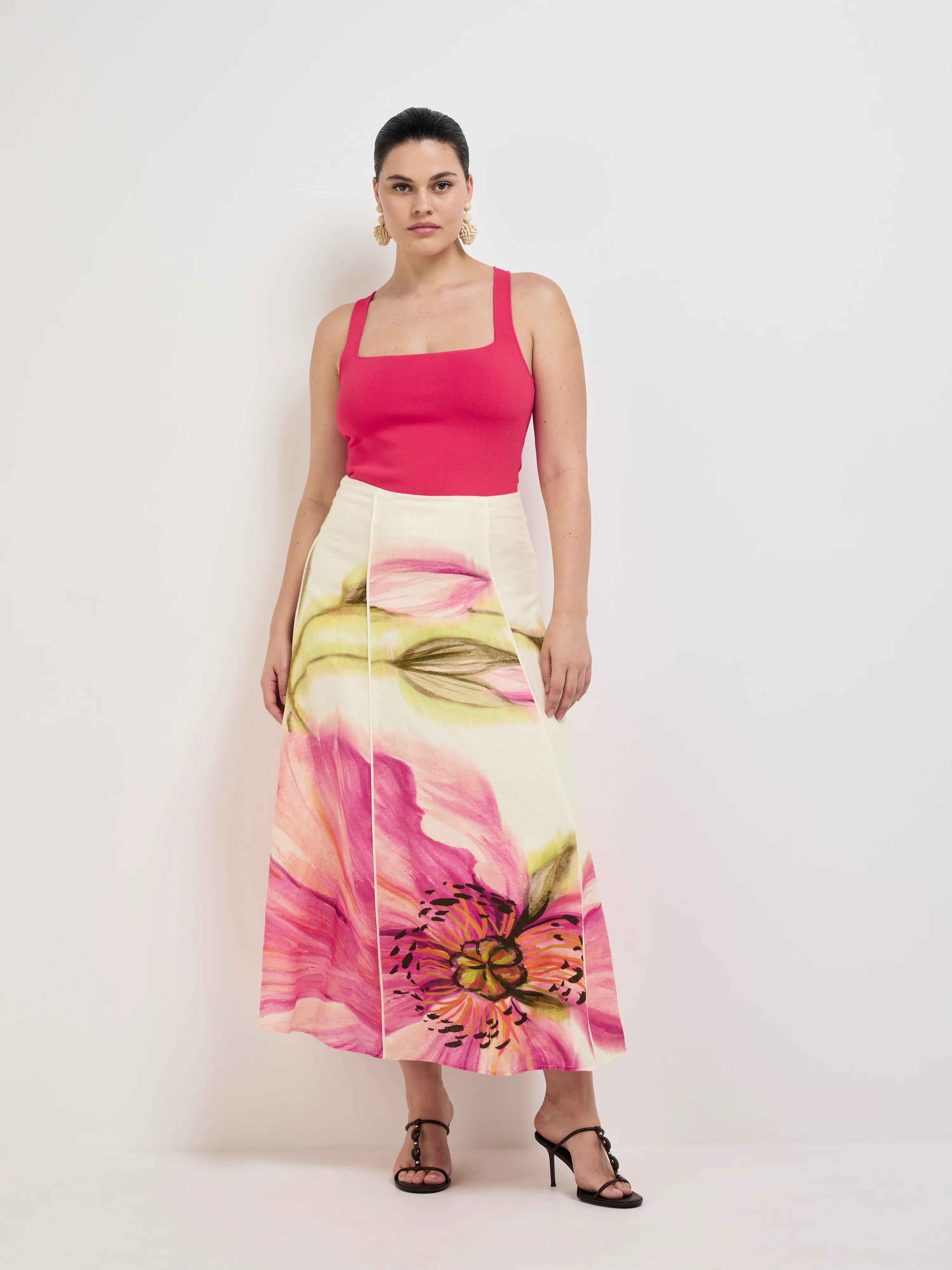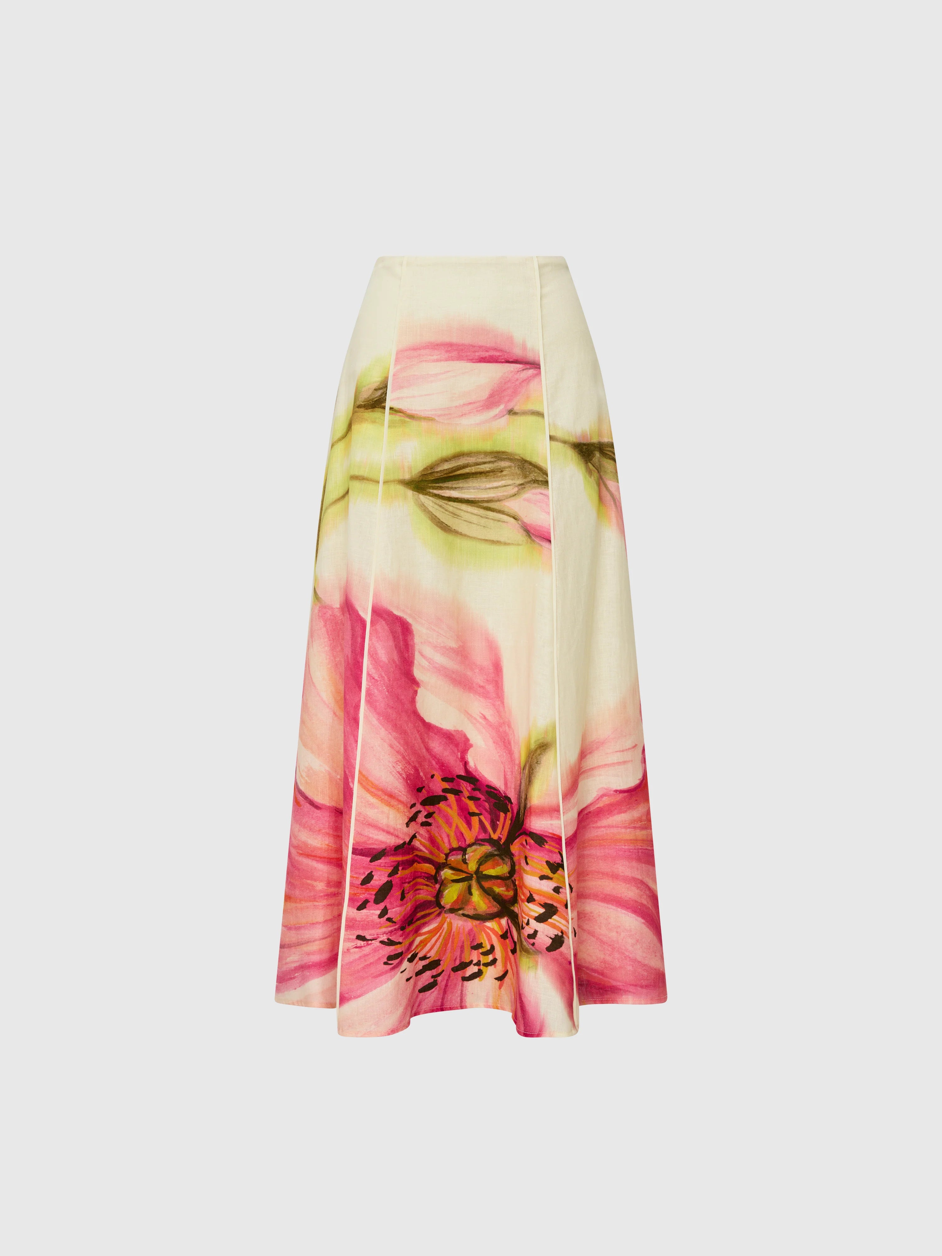 A brushstroke of beauty - Introducing the Poppy Midi Skirt. Showcasing a floral printed 100% Linen fabrication, fit and flare styling, fixed waistband, vertical seams at front and back with piping detail and midi length. Pair with our Leilani Top to complete the look.