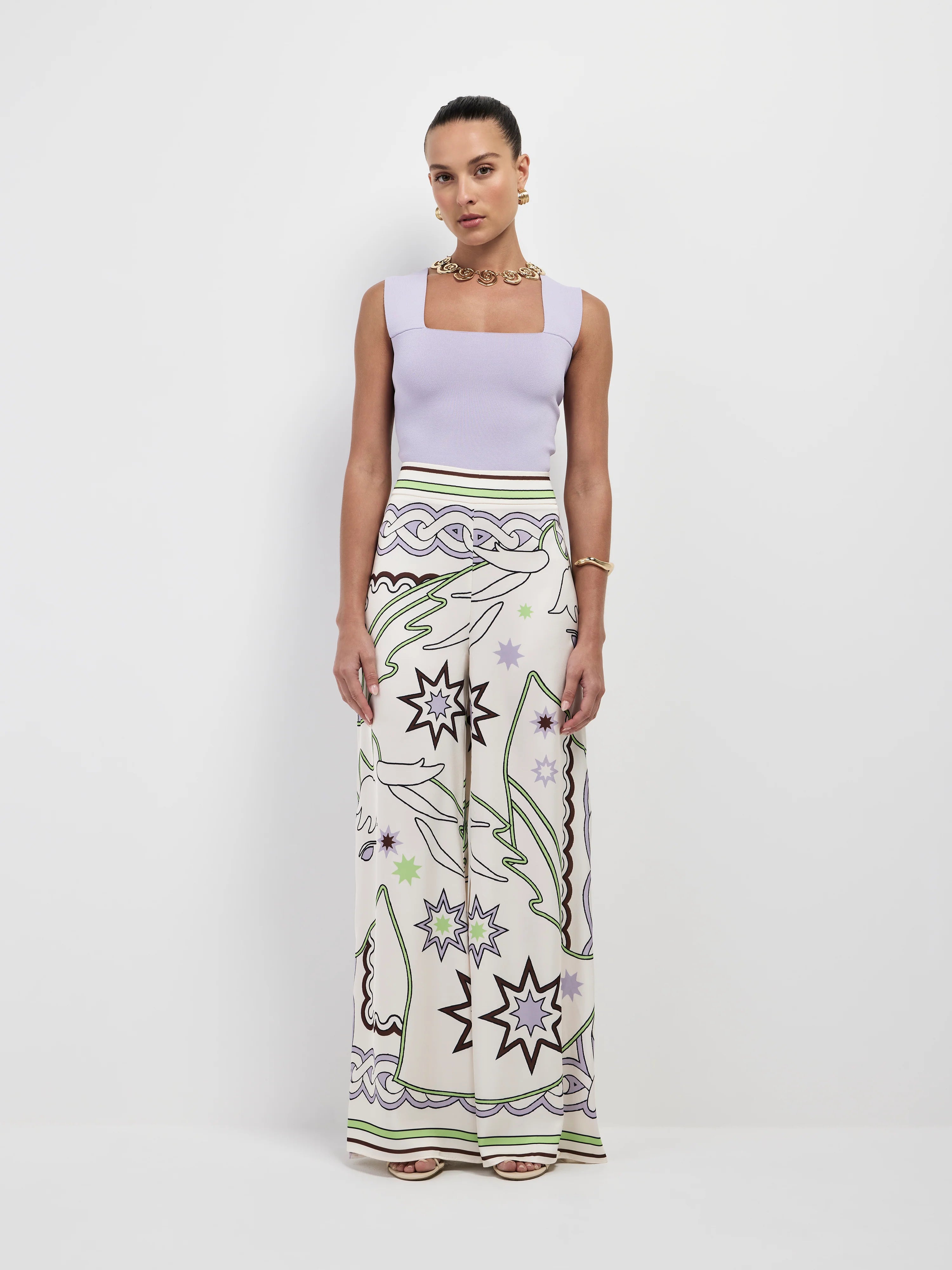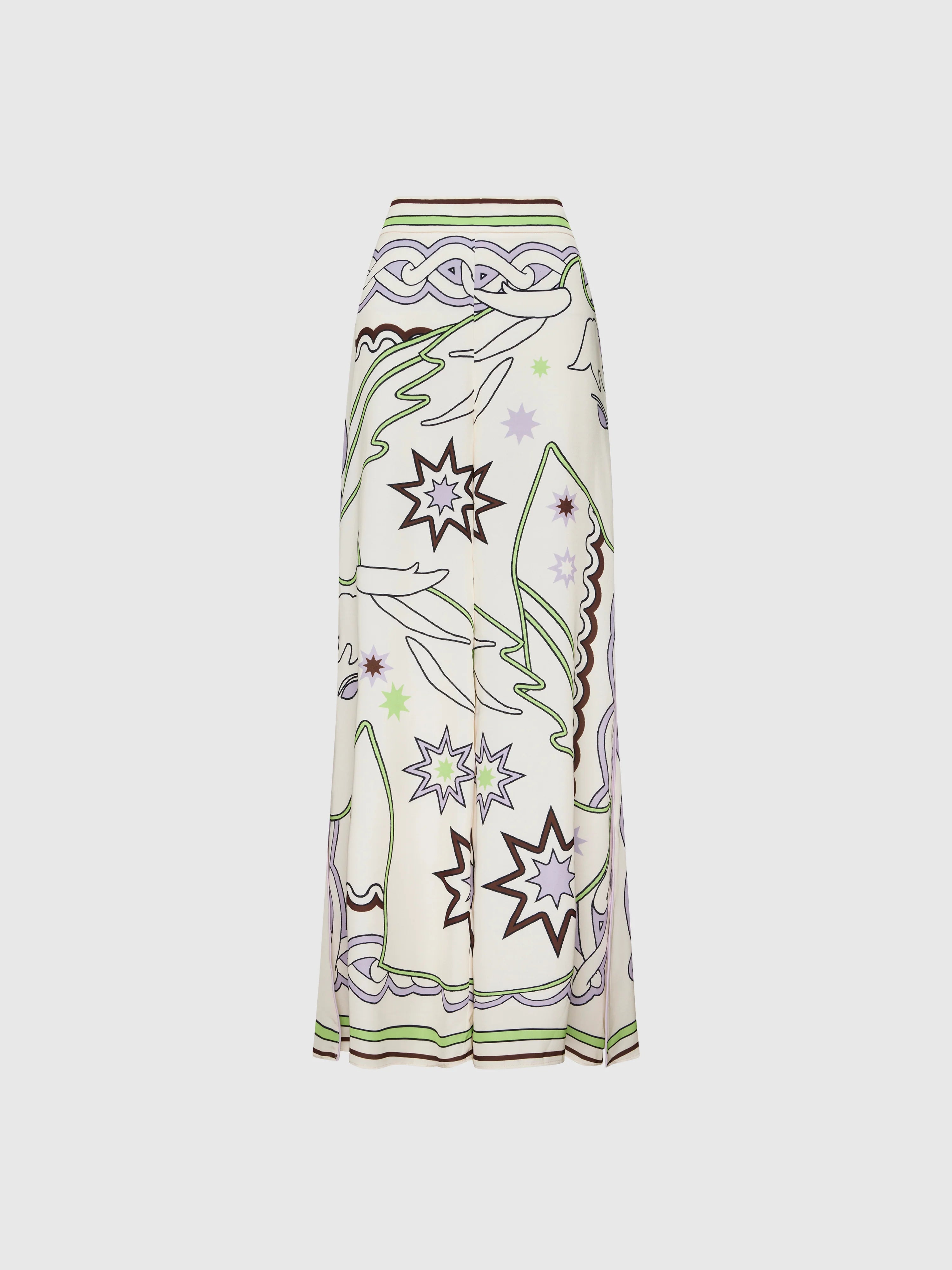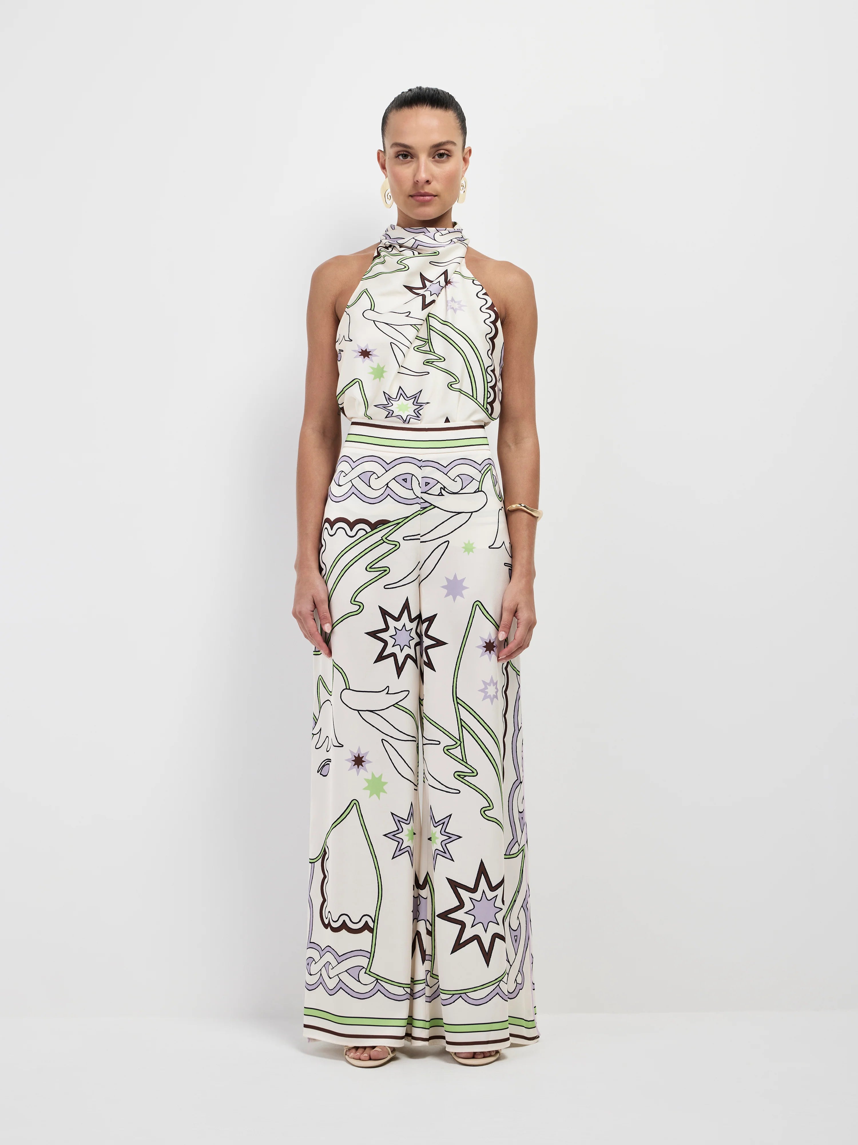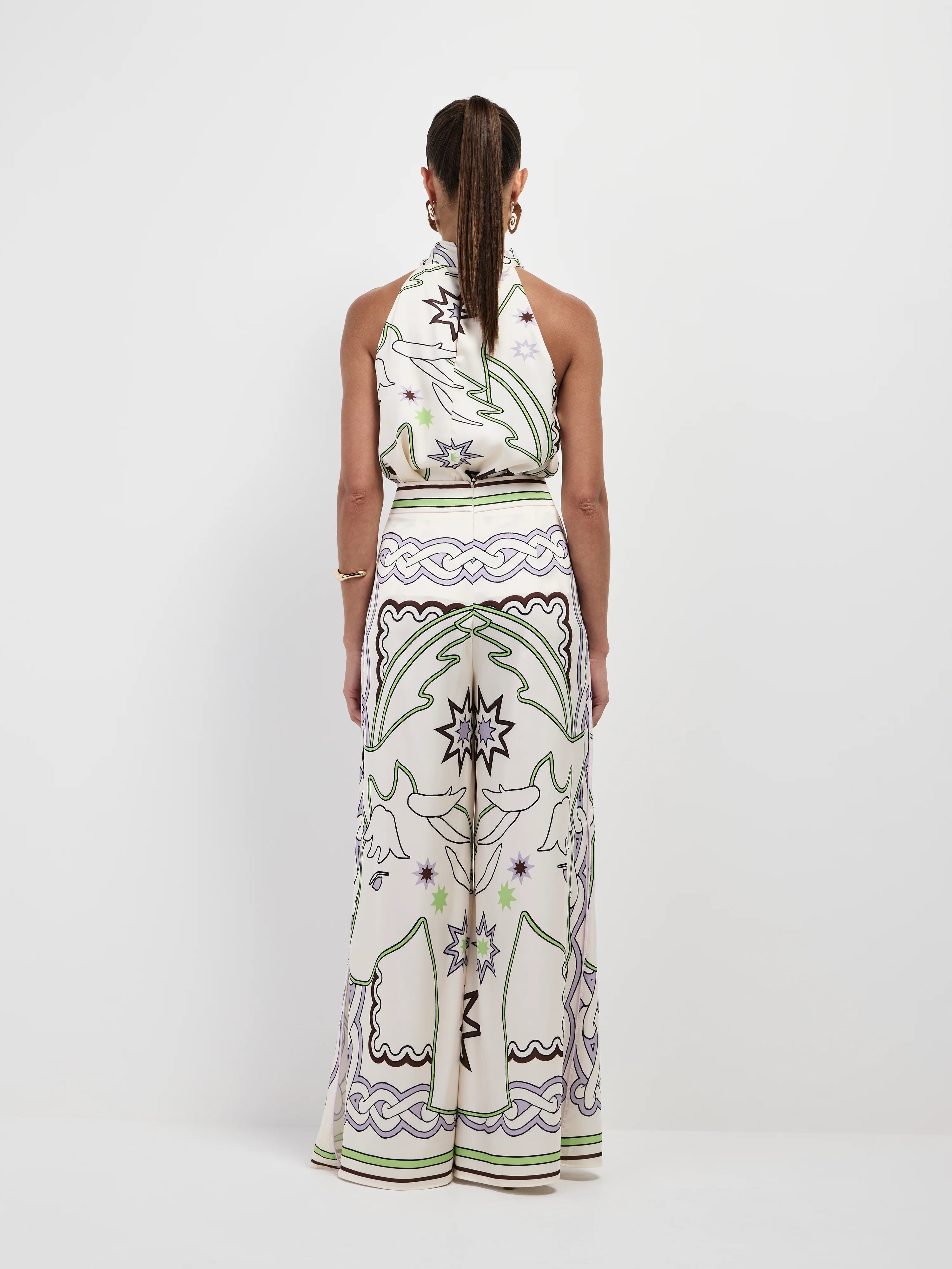 Playful prints take center stage with our Rodeo Pant. Featuring a printed satin fabrication, fixed waistband, wide leg with side seam splits, piping detail down side seam and relaxed fit. Pair with our matching Rodeo Top and Akai Earrings to complete the look.