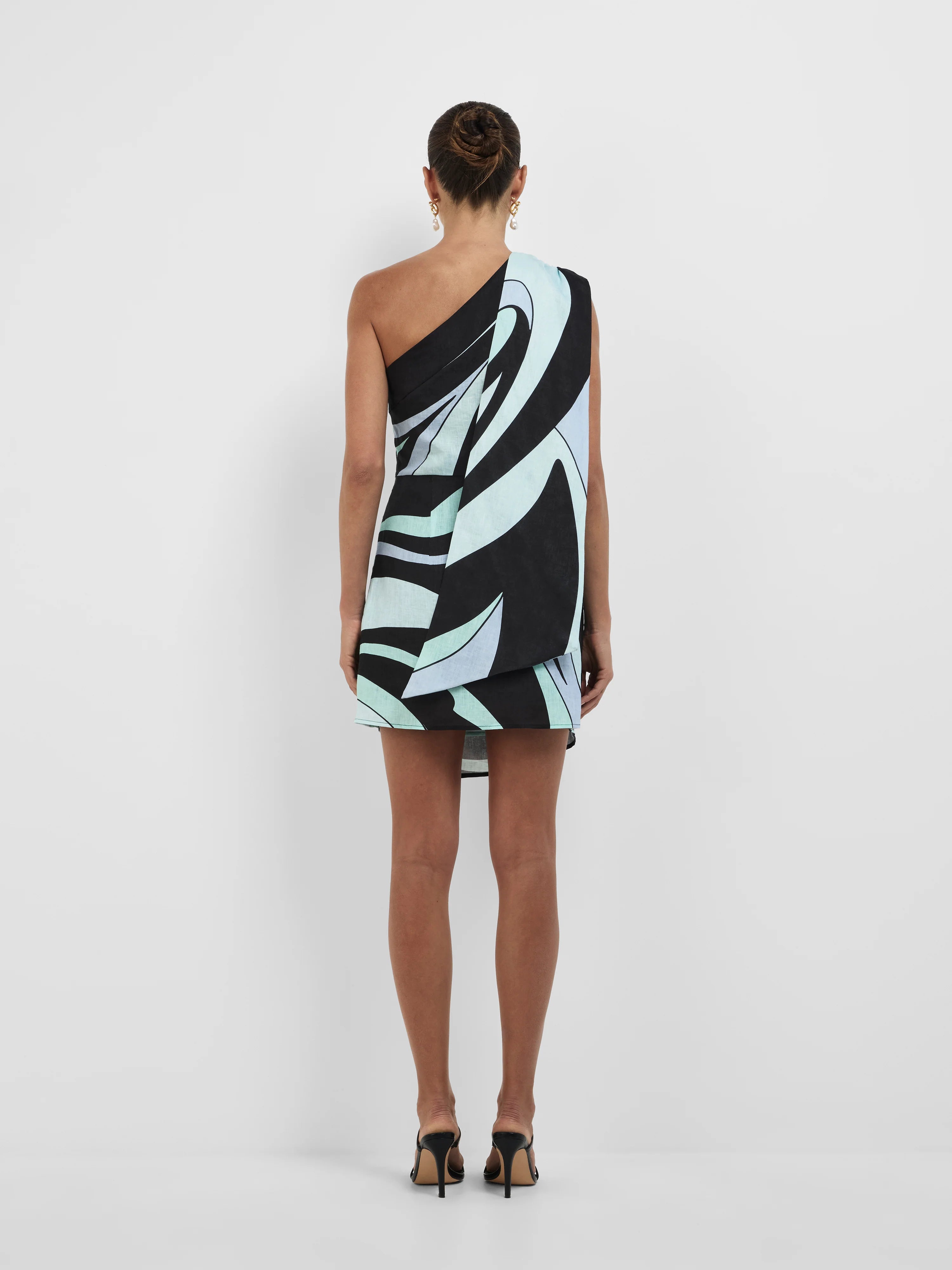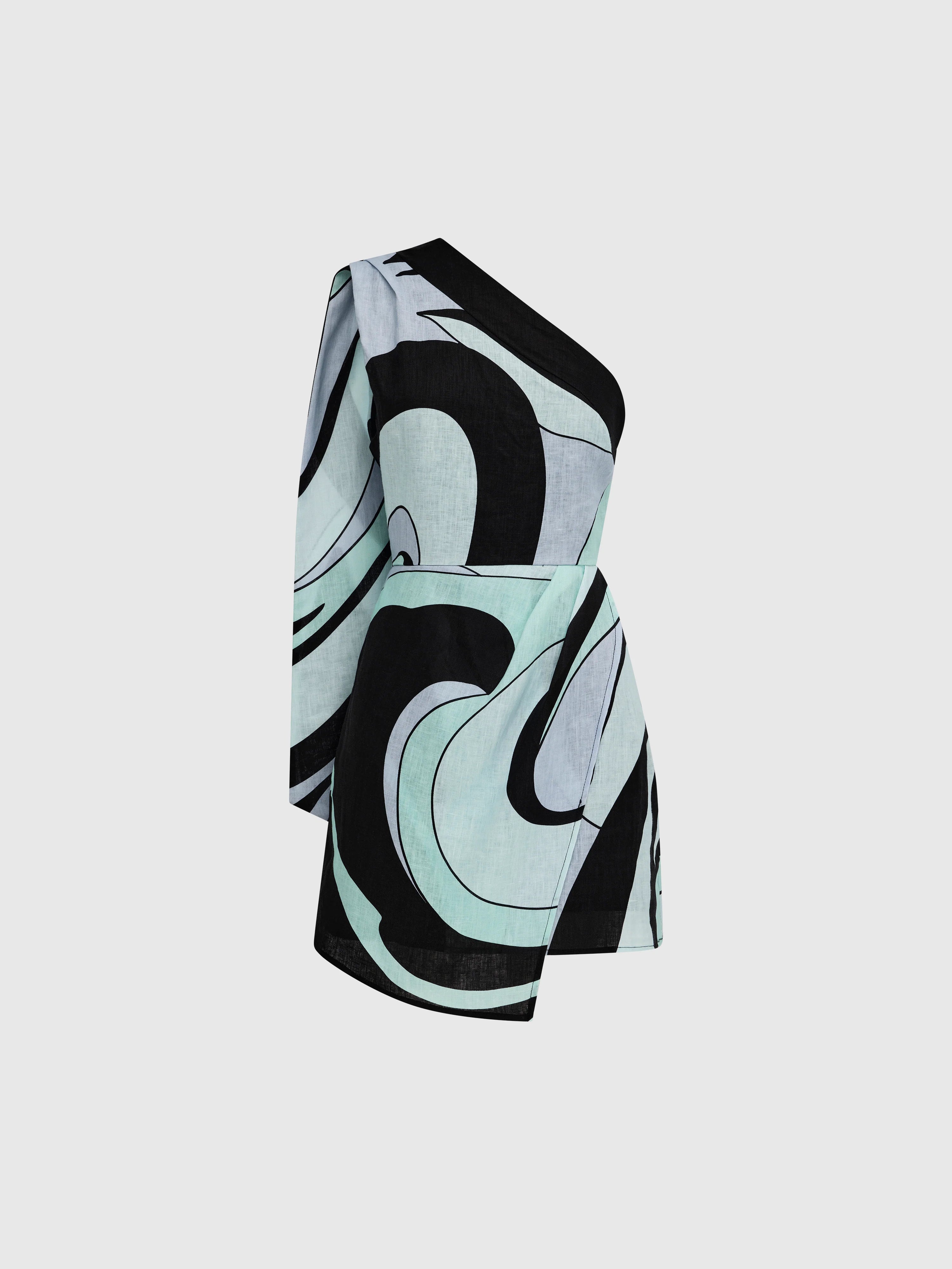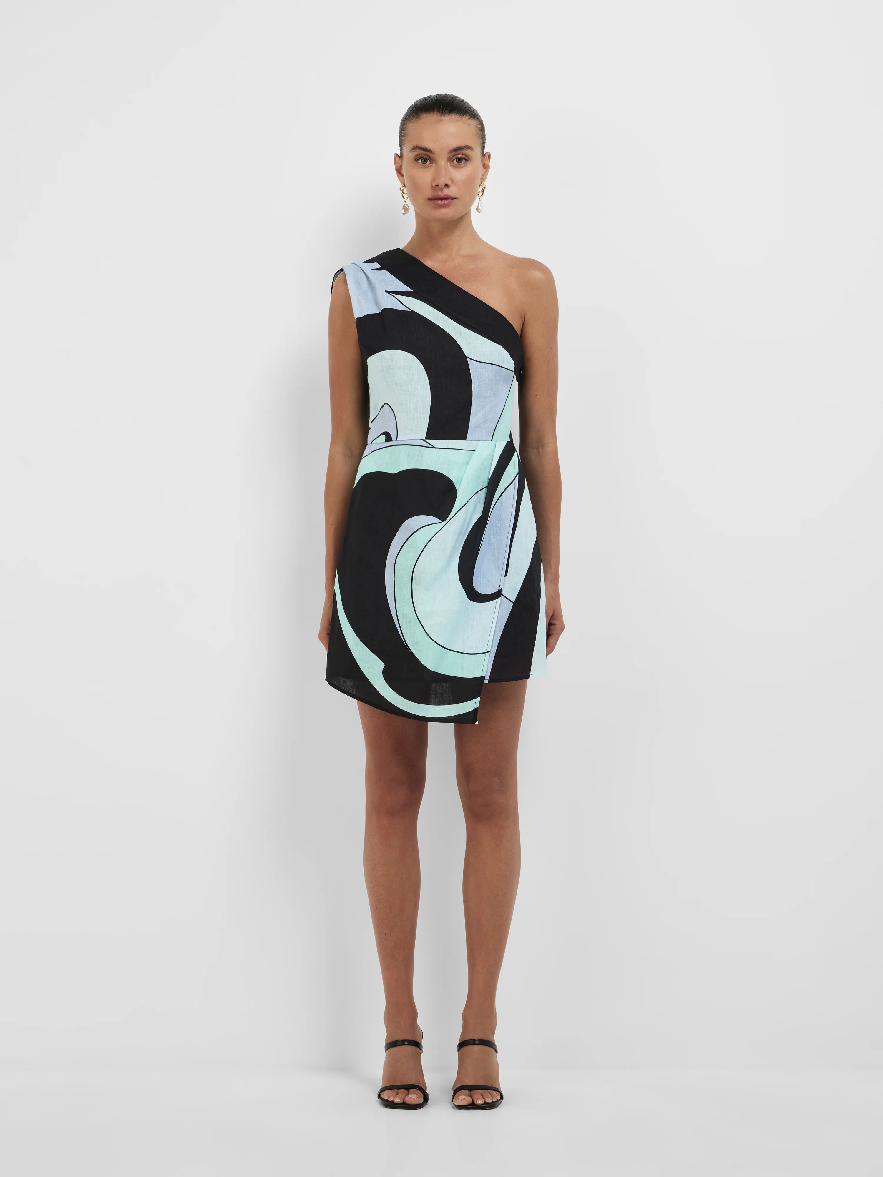 Bold and designed to stand out - Introducing the Romy Mini Dress. Featuring a 100% linen fabrication, fit-and-flare mini silhouette, asymmetrical neckline, wrap skirt detailing, geometric print throughout, and a sash tie detail at the right shoulder seam with an invisible zip at the left side seam. Complete the look with our Layla Earrings.